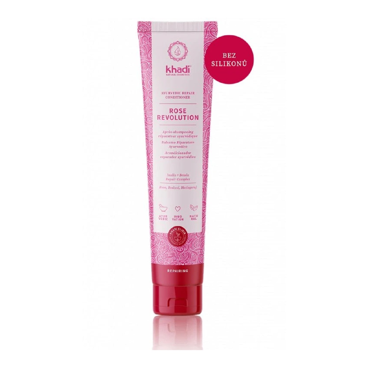 V kondicionéru Růže Revolution, stojícím na ajurvédě, spojuje Khadi sílu ajurvédy a nejnovější výzkumy v oblasti přírodní vlasové péče. Spolupůsobí v něm tak nově vyvinutý reparační komplex inulin-betain a Khadi elixír Růže Reparace, originální ajurvédský koncentrát, získaný podle prastarých tradic z ručně sbíraných indických pečujících rostlin, jako amla, brahmi, bhringaraj, ibišek či lékořice, jakož i z cenných růžových květů. Jeho intenzivně pečující vlastnosti stojí na ajurvédské filozofií, která říká, že zdravé vlasy souvisejí s rovnováhou vnitřní a vnější krásy.