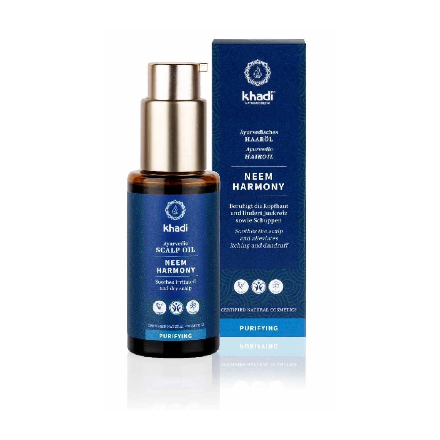 Intenzivní péče před mytím vlasů: Khadi ajurvédský olej Neem Harmonie pro vlasovou pokožku – pro zklidněnou, harmonickou vlasovou pokožku bez lupů, šupinatění a svědění.