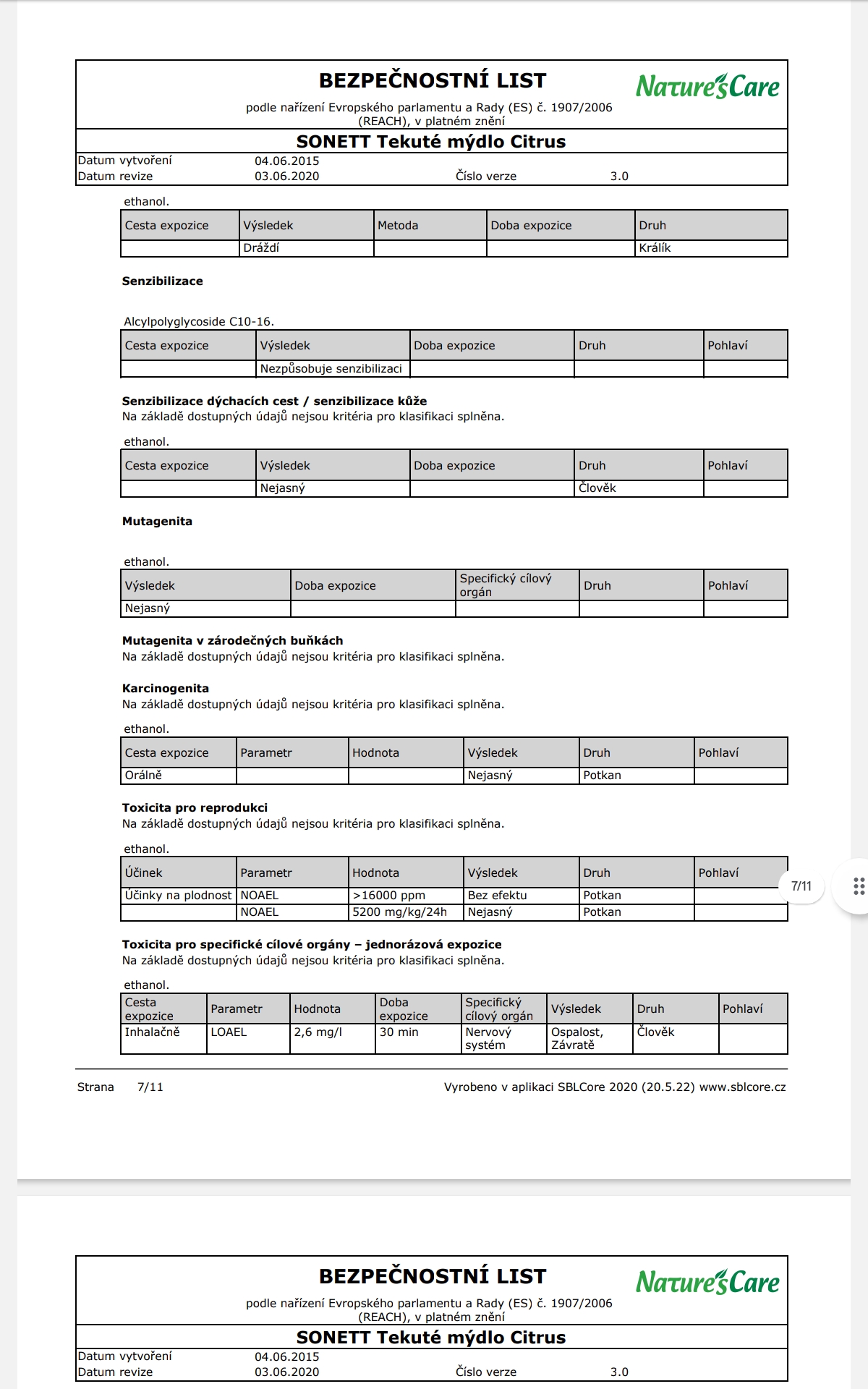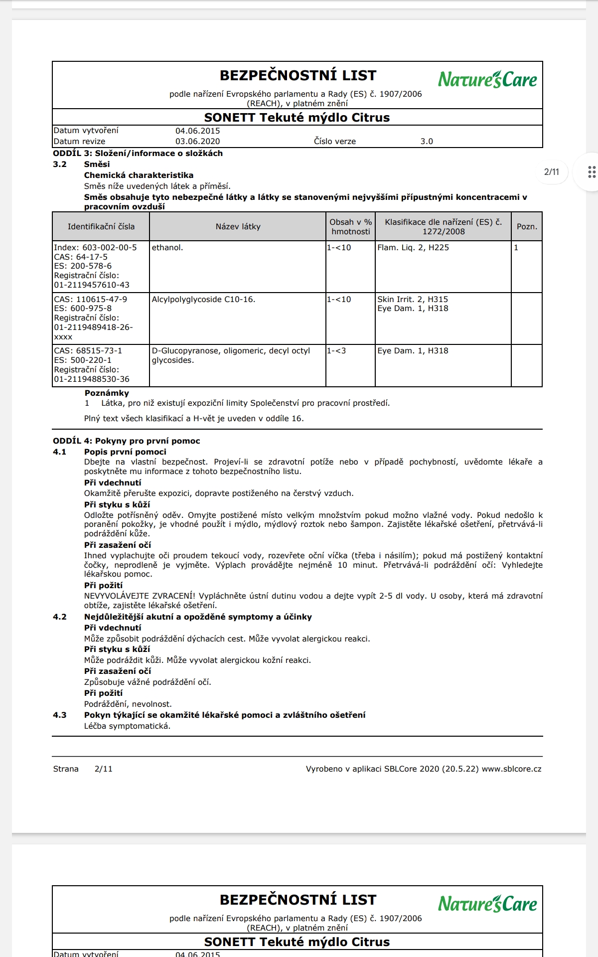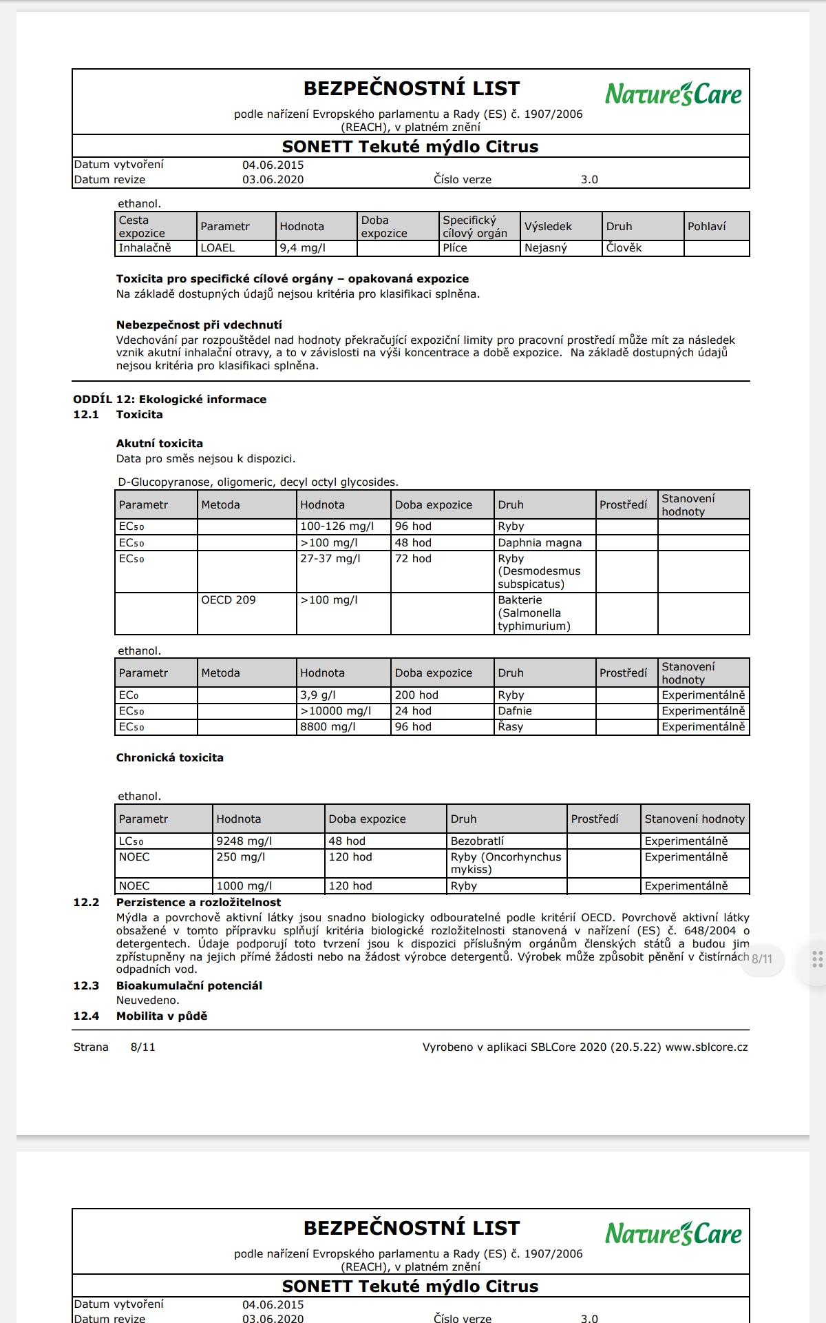 Biologické odbourávání: Mýdlo ztrácí okamžitě po použití, v bezprostřední reakci s vápníkem obsaženým vždy v odpadní vodě, své vlastností snižující povrchové napětí (primární odbourávání). Vápenaté mýdlo je následně ze 100 % rozkládáno na oxid uhličitý a vodu (sekundární odbourávání). Cukrové smáčedlo a deriváty kokosového oleje jsou získávány chemickou konverzí pomocí kyselin ze surových materiálů čistě rostlinného původu a kompletně si zachovávají svou přirozenou strukturu. Pro mikroorganismy je proto snadné je kompletně rozložit. Etanol je do přírodního cyklu navrácen během několika hodin.