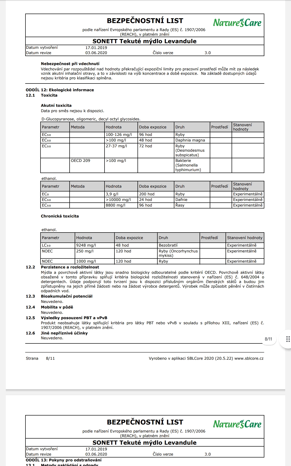 Biologické odbourávání: Mýdlo ztrácí okamžitě po použití, v bezprostřední reakci s vápníkem obsaženým vždy v odpadní vodě, své vlastností snižující povrchové napětí (primární odbourávání). Vápenaté mýdlo je následně ze 100 % rozkládáno na oxid uhličitý a vodu (sekundární odbourávání). Cukrové smáčedlo a deriváty kokosového oleje jsou získávány chemickou konverzí pomocí kyselin ze surových materiálů čistě rostlinného původu a kompletně si zachovávají svou přirozenou strukturu. Pro mikroorganismy je proto snadné je kompletně rozložit. Etanol je do přírodního cyklu navrácen během několika hodin.