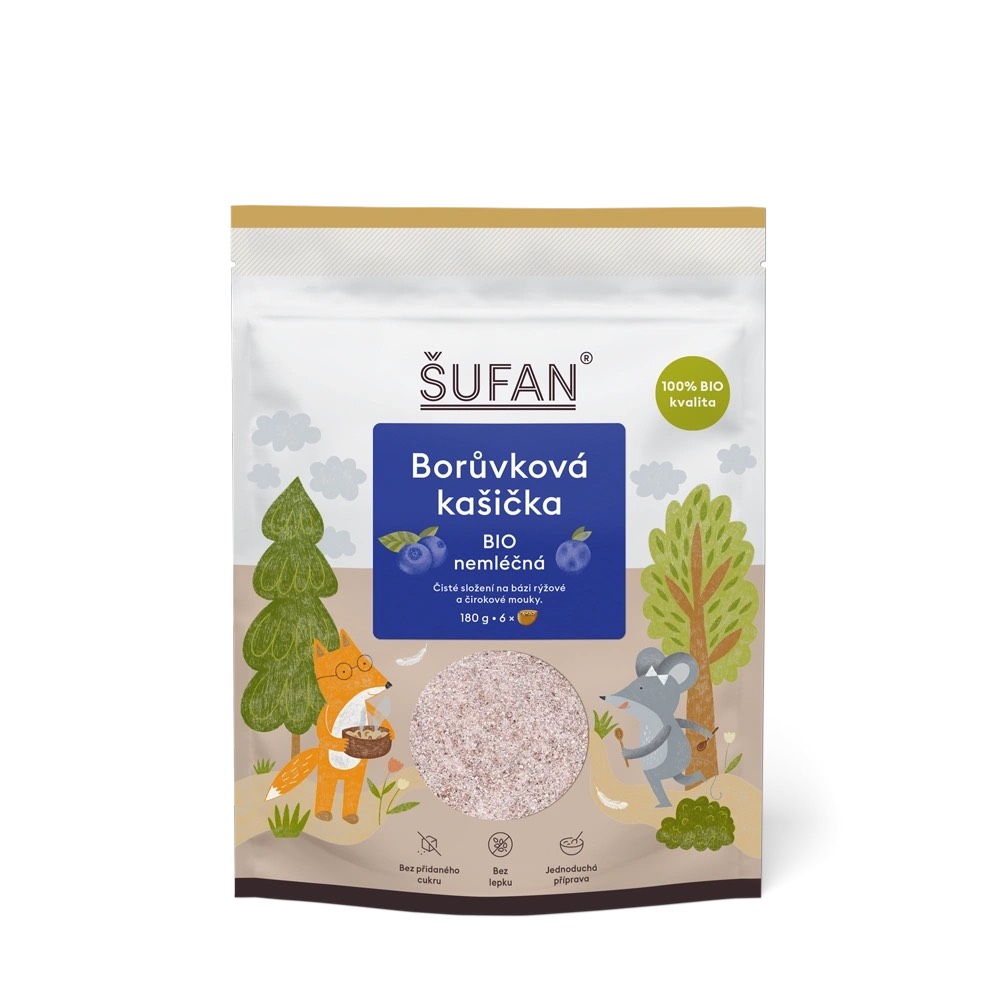 Protože si myška Maja přála snídat něco opravdu mimořádného, připravil jí lišák Lubo, známý svými lahodnými recepty, speciální borůvkovou kašičku. Její tajemství je v surovinách a jednoduchosti – stačilo smíchat rýžovou a čirokovou kaši, které příjemně zasytí, sušené kokosové mléko pro bohatou krémovost a prášek z mrazem sušených lesních borůvek, které kašičce dodávají příjemnou sladko-kyselou chuť a vůni. Borůvková kašička je díky tomu snadno stravitelná a přidaný cukr nebo umělé přísady v ní rozhodně nehledejte.. Zkrátka ideální volba pro citlivá dětská bříška.