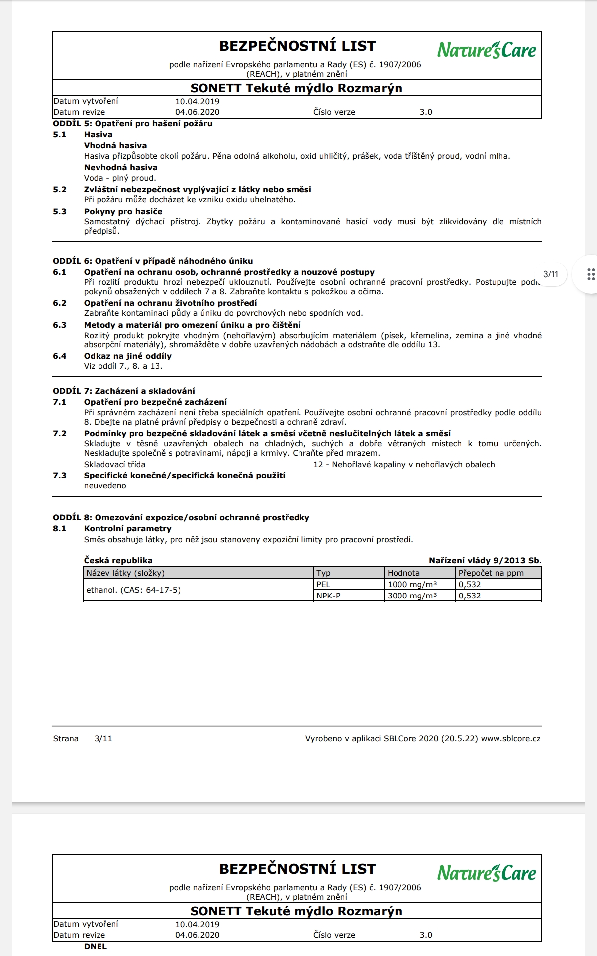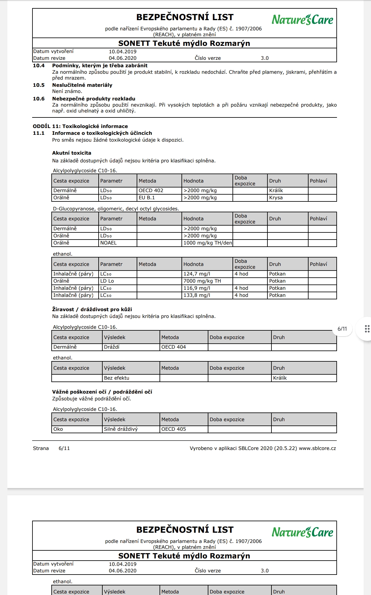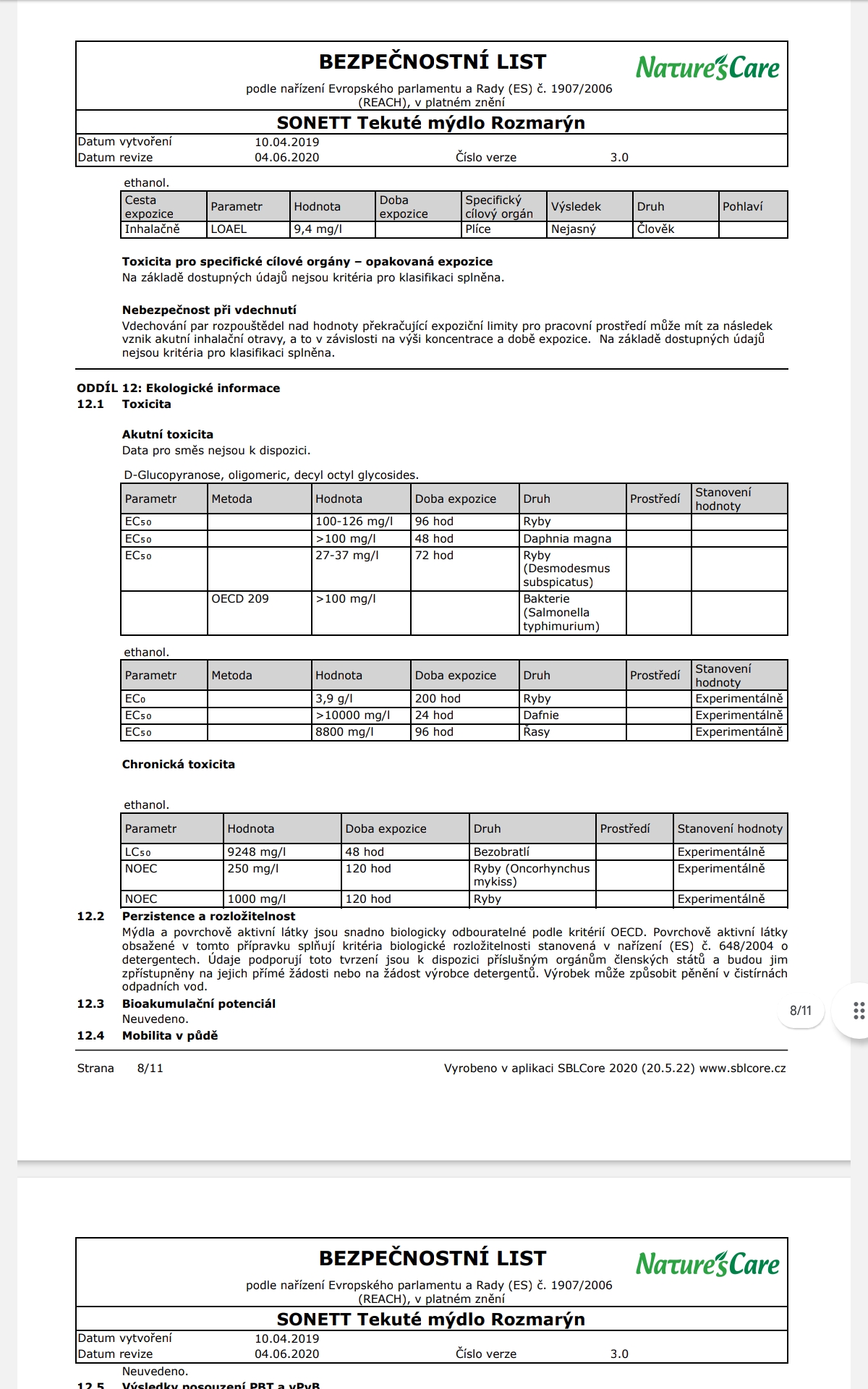 Biologické odbourávání: Mýdlo ztrácí okamžitě po použití, v bezprostřední reakci s vápníkem obsaženým vždy v odpadní vodě, své vlastností snižující povrchové napětí (primární odbourávání). Vápenaté mýdlo je následně ze 100 % rozkládáno na oxid uhličitý a vodu (sekundární odbourávání). Cukrové smáčedlo a deriváty kokosového oleje jsou získávány chemickou konverzí pomocí kyselin ze surových materiálů čistě rostlinného původu a kompletně si zachovávají svou přirozenou strukturu. Pro mikroorganismy je proto snadné je kompletně rozložit. Etanol je do přírodního cyklu navrácen během několika hodin.