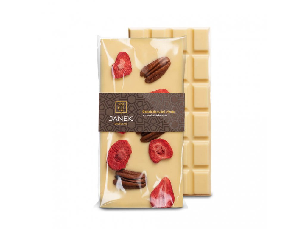 Bílá čokoláda s pekanovými ořechy a lyofilizovanými jahodami.