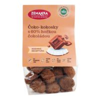 Mouka PŠENIČNÁ hladká*, neztužený rostlinný tuk* (slunečnicový olej* a kakaové máslo* v různém poměru, voda, emulgátor: slunečnicový lecitin*, kyseliny: kyselina citronová), třtinový cukr*, kokos* 16,7 %, hořká čokoláda* 8,8 % (třtinový cukr*, kakaová hmota*, kakakové máslo* - obsah kakaové složky v čokoládě nejméně 60 %, emulgátor: slunečnicový lecitin), mouka PŠENIČNÁ celozrnná*, kakao* 3,0 %, vanilkové aroma*. Může obsahovat stopy vajec, mléčných výrobků (včetně laktózy) a skořápkových plodů (lískové a vlašské ořechy).*produkt kontrolovaného ekologického zemědělství