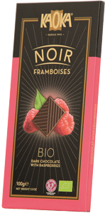 Výrazná hořká KAOKA čokoláda s kousky sušených voňavých malin bez mléka a aromat.