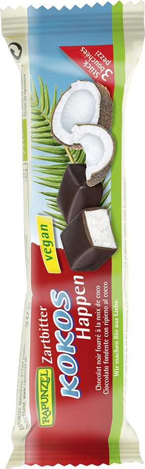 kokos 36 %, hořká čokoláda 25 % (třtinový cukr, kakaová hmota, kakaové máslo, kakaová sušina 55 %), rýžový sirup, agávový sirup, sušený rýžový sirup, rýžová mouka. Všechny složky pocházejí z kontrolovaného ekologického zemědělství.