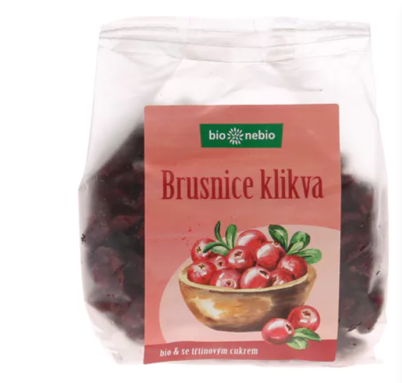 brusnice klikva 60 %, přírodní třtinový cukr. Povrchově ošetřeno slunečnicovým olejem. Všechny suroviny pocházejí z kontrolovaného ekologického zemědělství.