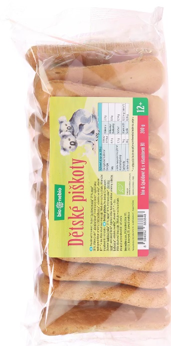 Dětské piškoty jsou pečené ze špaldové mouky a obohacené vitamínem B1. Slazené jsou třtinovým cukrem.