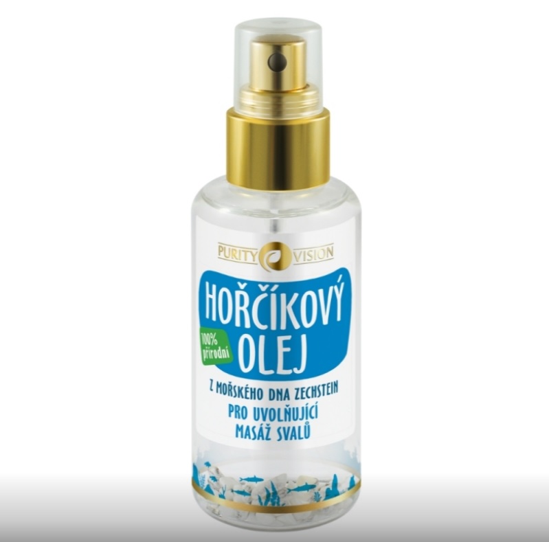 Hořčíkový olej PURITY VISION® je 100% přírodní masážní přípravek pro relaxaci a uvolnění nejen namožených svalů. Je získáván z hořčíkových solí usazených na dně tzv. Zechsteinského moře, které je označováno za nejčistší zdroj hořčíku na světe. Stejně jako mořská voda, Hořčíkový olej pomáhá hydratovat pokožku a díky rozpuštěné magneziové soli podporuje přirozenou ochrannou bariéru kůže, hydratuje a podporuje regeneraci kožních buněk.