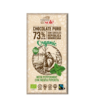 Tato osvěžující hořká čokoláda obsahuje vysoký podíl špičkového dominikánského kakaa (73 %) a přírodní třtinový cukr z Brazílie. Ovoněná je ochlazující mátou peprnou a čistou vanilkou a neobsahuje žádné emulgátory. Bio čokolády značky SOLÉ na sobě nesou logo FAIR TRADE. Fair trade - spravedlivý obchod - garantuje farmářům z rozvojových zemí spravedlivou odměnu a zakazuje otrockou a dětskou práci.