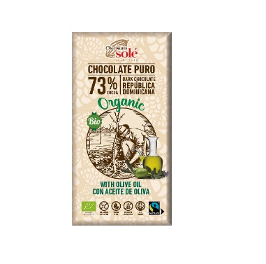 Tato jedinečná čokoláda obsahuje vysoký podíl špičkového dominikánského kakaa (73 %) a přírodní třtinový cukr z Brazílie. Ovoněná je pouze čistou vanilkou a neobsahuje žádné emulgátory. Na první pohled však zaujme hlavně přídavek extra panenského olivového oleje. Ten není jen samoúčelnou snahou o originalitu, ale dodává čokoládě překvapivou jemnost a sametovou texturu a vyvažuje zemitou chuť kakaa. Tato čokoláda skutečně stojí za ochutnání nejen milovníkům kuriozit. Bio čokolády značky SOLÉ na sobě nesou logo FAIR TRADE. Fair trade - spravedlivý obchod - garantuje farmářům z rozvojových zemí spravedlivou odměnu a zakazuje otrockou a dětskou práci.