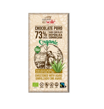 Tato jedinečná čokoláda obsahuje vysoký podíl špičkového dominikánského kakaa (73 %) a místo běžného cukru je k oslazení použit sirup z agáve. Ovoněná je pouze čistou vanilkou a neobsahuje žádné emulgátory. Vysoký obsah vlákniny je daný přídavkem vlákniny z agáve - inulinu. Čokoláda je vhodná pro ty, kteří se vyhýbají klasickému cukru (sacharóze) a zároveň jim nedělají dobře náhradní sladidla. Sirup z agáve je přírodní sladidlo, které přirozeně obsahuje hlavně fruktózu. Bio čokolády značky SOLÉ na sobě nesou logo FAIR TRADE. Fair trade - spravedlivý obchod - garantuje farmářům z rozvojových zemí spravedlivou odměnu a zakazuje otrockou a dětskou práci.