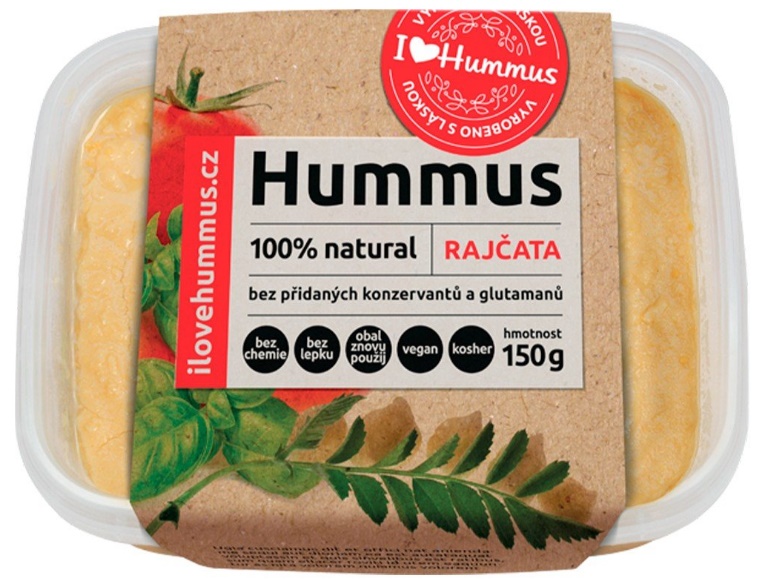 vařená cizrna (51%), sezamová pasta (tahini), pitná voda, krajená rajčata (9%, rajčata, rajčatová šťáva, regulátor kyselosti: kyselina citrónová), citronová šťáva, ext. panenský olivový olej, rajčatový protlak (rajčata, jedlá sůl), jedlá mořská sůl, sušená bazalka (0,13%), koření. "Špetka lásky a nic jiného"
