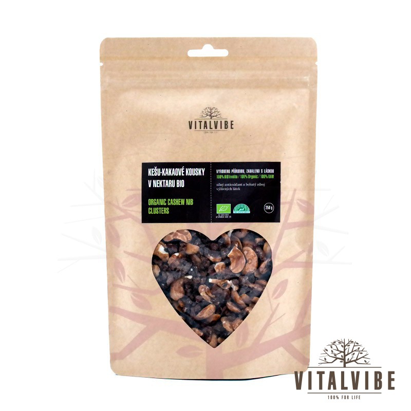 Základem jsou naše skutečně přírodní kakaové kousky a kešu oříšky. Ty jsou namáčeny v květovém kokosovém nektaru s nízkým glykemickým indexem, který je sám o sobě potravinou.