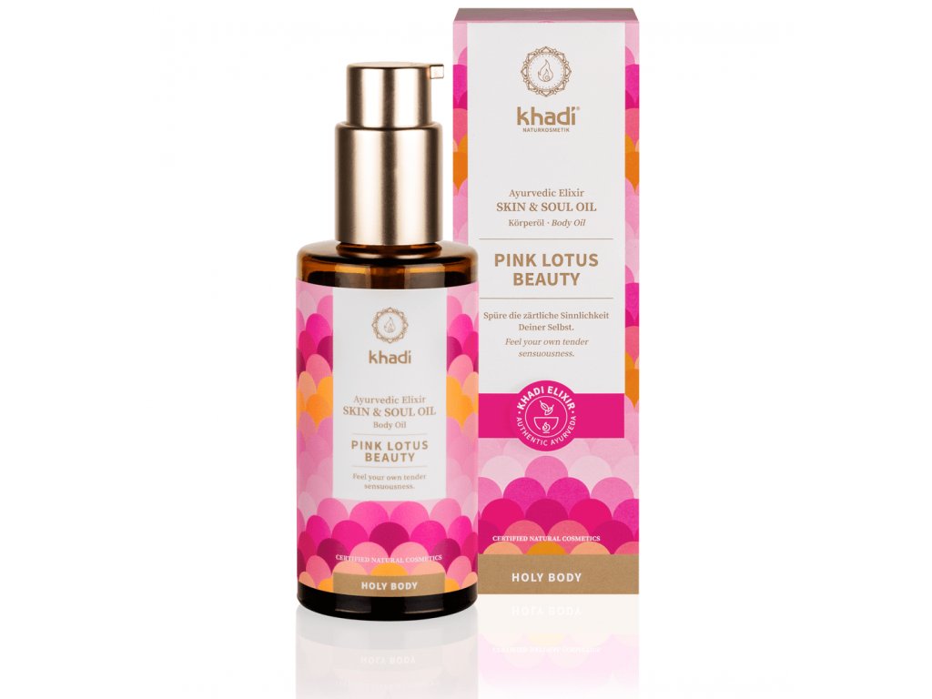 Tajemství harmonizačního a zkrášlujícího působení spočívá v Khadi elixíru Růžový lotos Krása: ručně sbírané indické léčivé rostliny jsou pomocí tradičních ajurvédských procesů citlivě ohřívaný nad otevřeným ohněm. Získané extrakty z rostlin (ajurvédsko-medicinální koncentráty) jsou poté propojeny na základě ajurvédských receptur do synergického komplexu - Khadi elixíru. Díky tomuto harmonickému celku jsou specifické účinky jednotlivých rostlin maximalizovány. Khadi elixír je zapracován, opět cestou pravých ajurvédských postupů, do vybraných pečujících olejů. Celé toto rostlinné bohatství doplňuje zároveň kompozice olejů éterických.