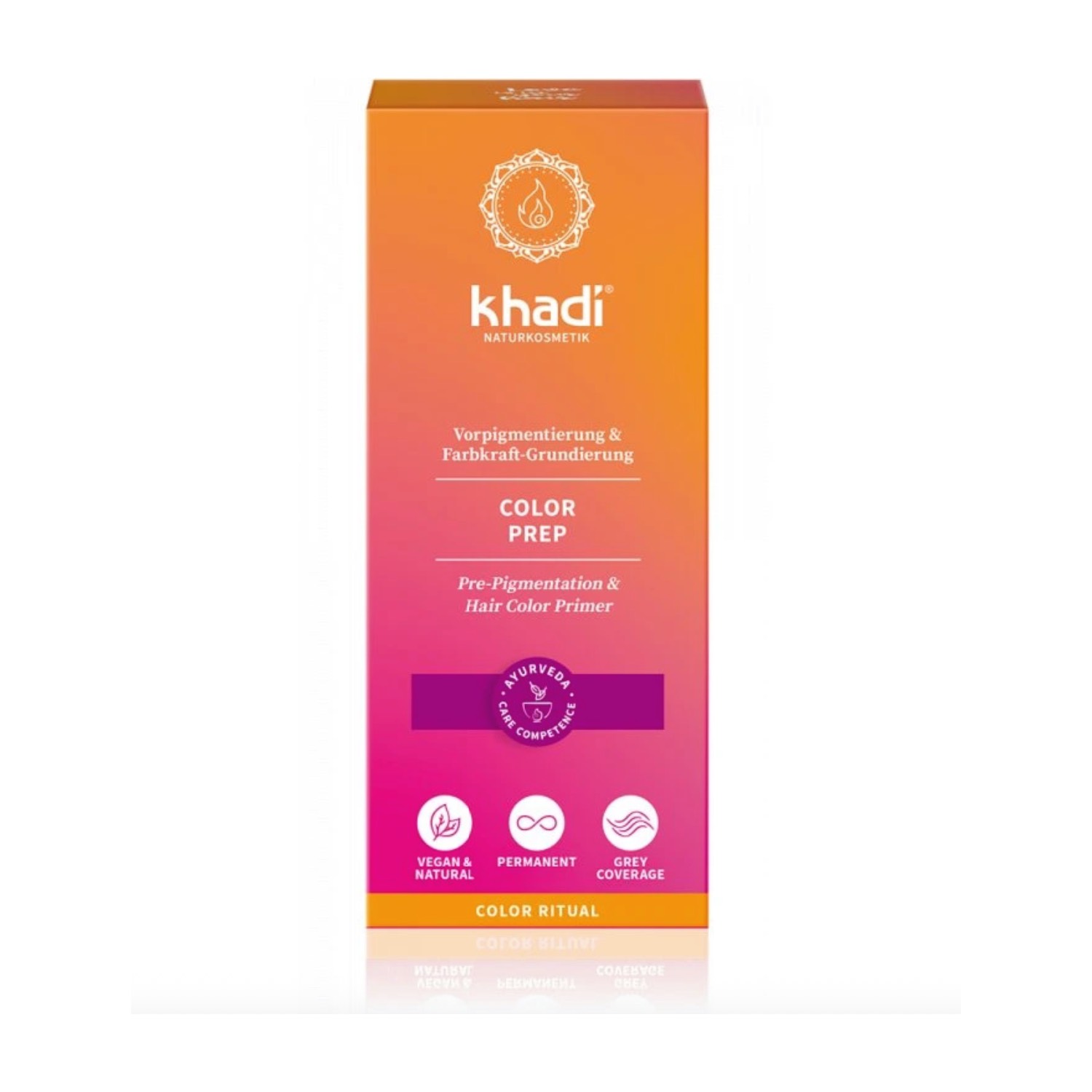 Khadi Color Prep není pouze předpigmentací. Avšak díky obsahu rostliny senna neboli cassia působí jako regenerační keratinová kúra. Posiluje a chrání vlasy a vyhlazuje vlasovou strukturu poškozených pramenů. Tradiční ajurvédská jujuba (ziziphus) dodává vlasům hydrataci, regeneruje je skrz naskrz a dává jim zářivý lesk. Díky obsahu rostliny henna vzniká ve vlasech teplý odstín, který je perfektním barevným základem pro barevný "skok" z šedých či velmi světlých vlasů do tmavých či popelavých odstínů. Kromě toho henna intenzivně pečuje o pokožku hlavy a posiluje vlasy od kořínků ke konečkům.