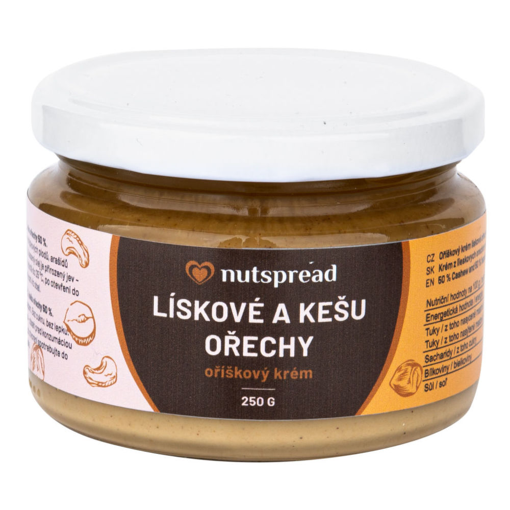 LÍSKOVÉ OŘECHY 50 %, KEŠU OŘECHY 50 %. Může obsahovat stopy jiných skořápkových plodů, arašídů a sezamu.