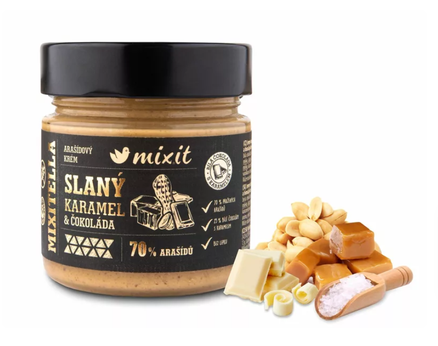 Nechte na jazyku rozplynout 70% krém z výběrových pražených arašídů, který jsme zjemnili bílou karamelovou čokoládou. Chuťový zážitek umocní drobná zrníčka soli, která si zamilujete s první lžičkou. :-) Mixitelly neobsahují žádné umělé konzervanty ani palmový olej.