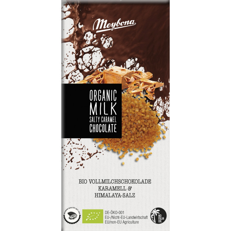 BIO mléčná čokoláda s kousky karamelu (10 %) a himalájskou solí (0,4 %).