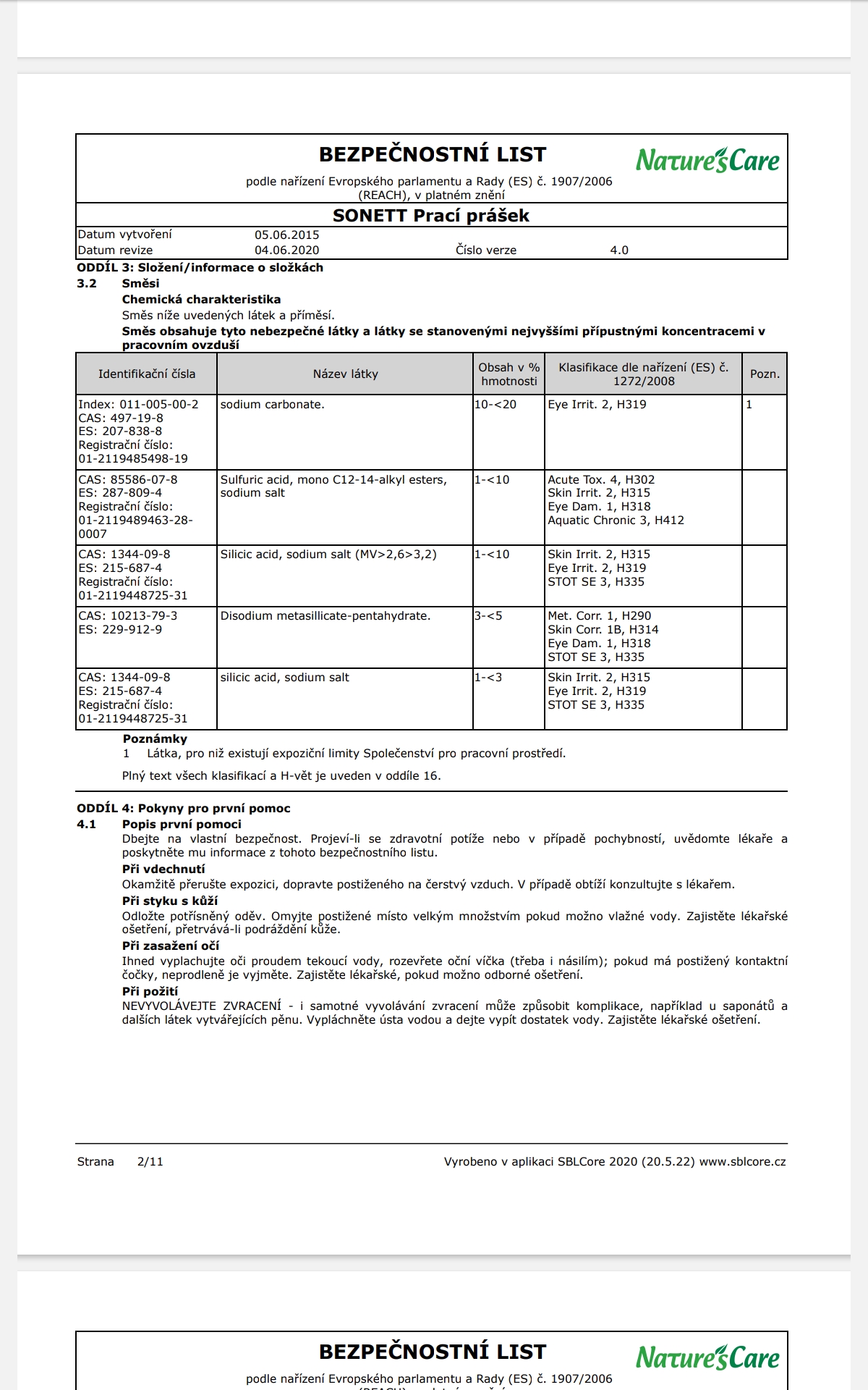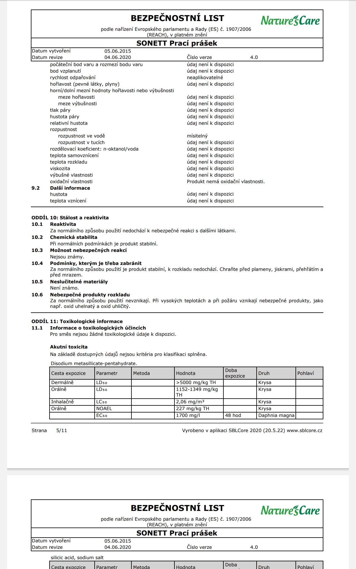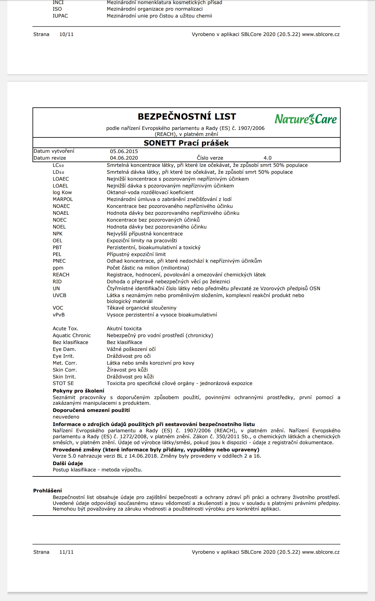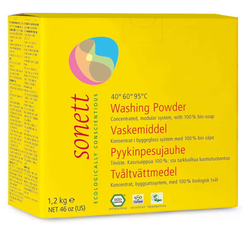 Původ a vlastnosti jednotlivých složek: Prací prostředek SONETT obsahuje jako hlavní účinnou látku mýdlo které se vyrábí z různých rostlinných olejů, palmového, řepkového, kokosového a olivového, a to vařením s louhem. Oleje pocházejí zčásti z ekologické resp. bio-dynamické produkce. Mýdlo jako aktivní mycí látka v sobě jedinečným způsobem spojuje všechny, pro proces praní nezbytné, vlastnosti smáčení nečistoty, jejího rozpouštění a pohlcení. Soda se vyrábí přeměnou vápna pomocí kuchyňské soli. ORTOKŘEMIČITAN vzniká roztavením křemičitého písku a sody. Soda a ortokřemičitan posilují svou zásaditostí mycí louh a podporují uvolňování zejména mastných látek. Zeolit A a vrstevnatý křemičitan mají jako výchozí surovinu křemičité horniny. Vedle své vlastnosti poutat vápník ve vodě poutají tyto složky zároveň i organické látky rozpuštěné v prací vodě a barevné pigmenty a zabraňují jejich usazování na prádle. Derivát kokosového oleje podporuje mýdlo v jeho funkci rozpouštění tuků.