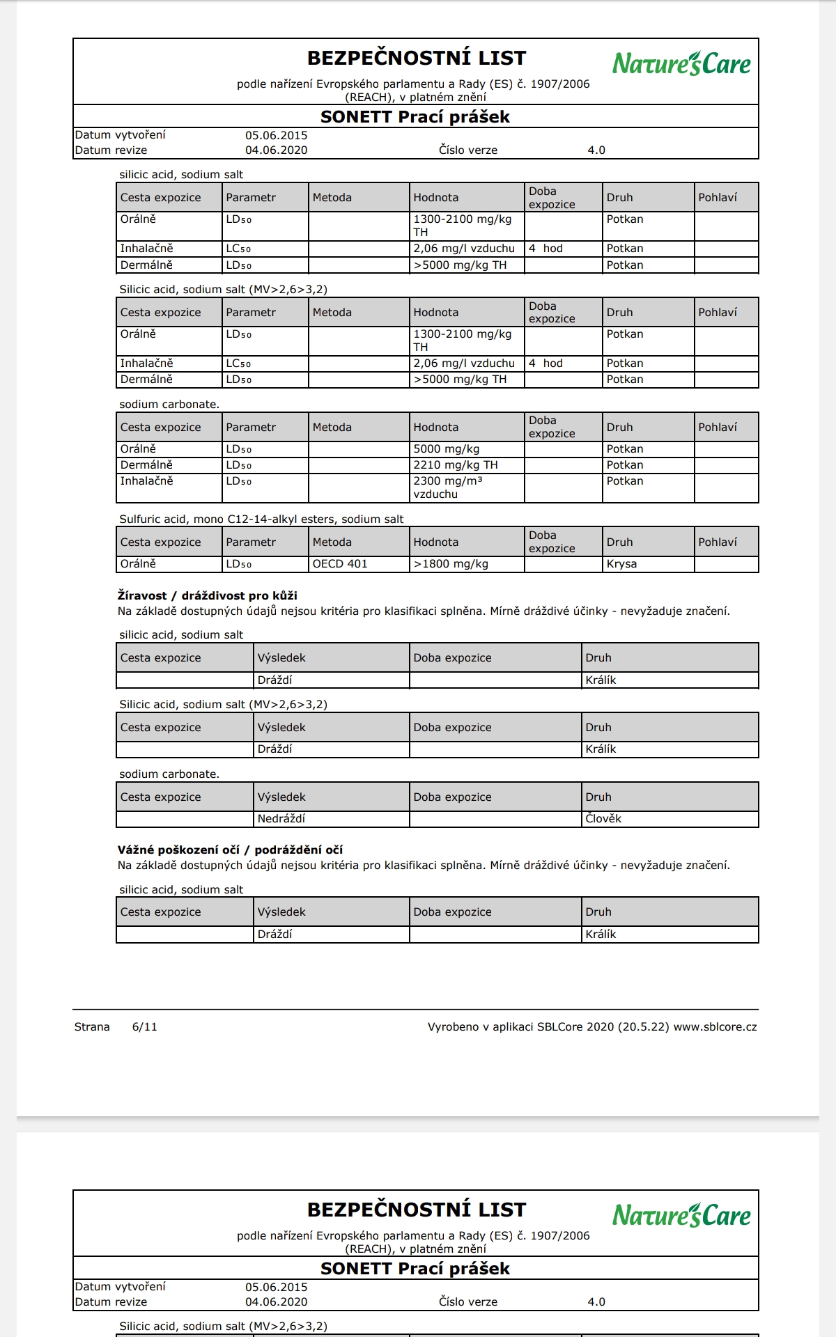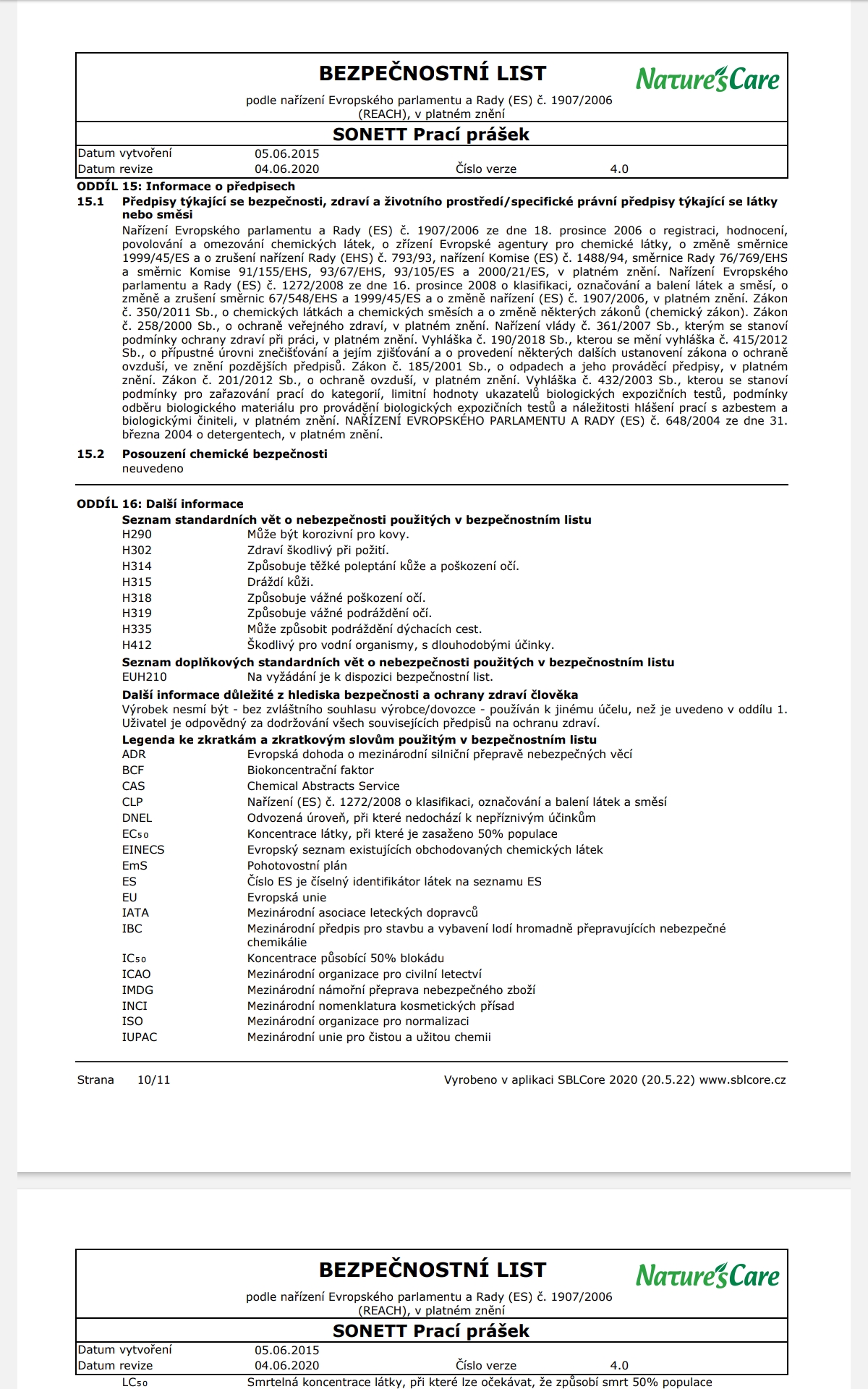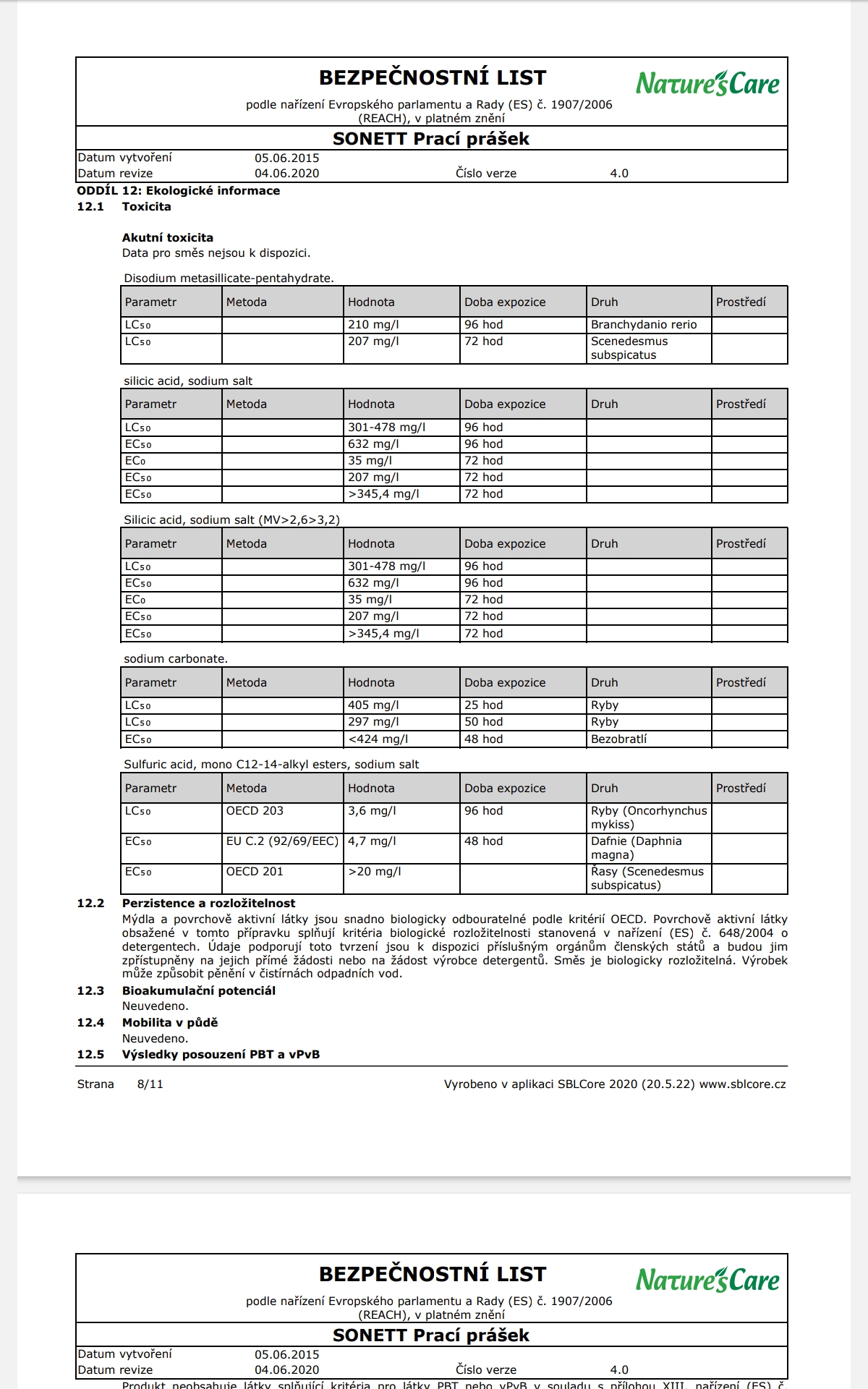 Původ a vlastnosti jednotlivých složek: Prací prostředek SONETT obsahuje jako hlavní účinnou látku mýdlo které se vyrábí z různých rostlinných olejů, palmového, řepkového, kokosového a olivového, a to vařením s louhem. Oleje pocházejí zčásti z ekologické resp. bio-dynamické produkce. Mýdlo jako aktivní mycí látka v sobě jedinečným způsobem spojuje všechny, pro proces praní nezbytné, vlastnosti smáčení nečistoty, jejího rozpouštění a pohlcení. Soda se vyrábí přeměnou vápna pomocí kuchyňské soli. ORTOKŘEMIČITAN vzniká roztavením křemičitého písku a sody. Soda a ortokřemičitan posilují svou zásaditostí mycí louh a podporují uvolňování zejména mastných látek. Zeolit A a vrstevnatý křemičitan mají jako výchozí surovinu křemičité horniny. Vedle své vlastnosti poutat vápník ve vodě poutají tyto složky zároveň i organické látky rozpuštěné v prací vodě a barevné pigmenty a zabraňují jejich usazování na prádle. Derivát kokosového oleje podporuje mýdlo v jeho funkci rozpouštění tuků.