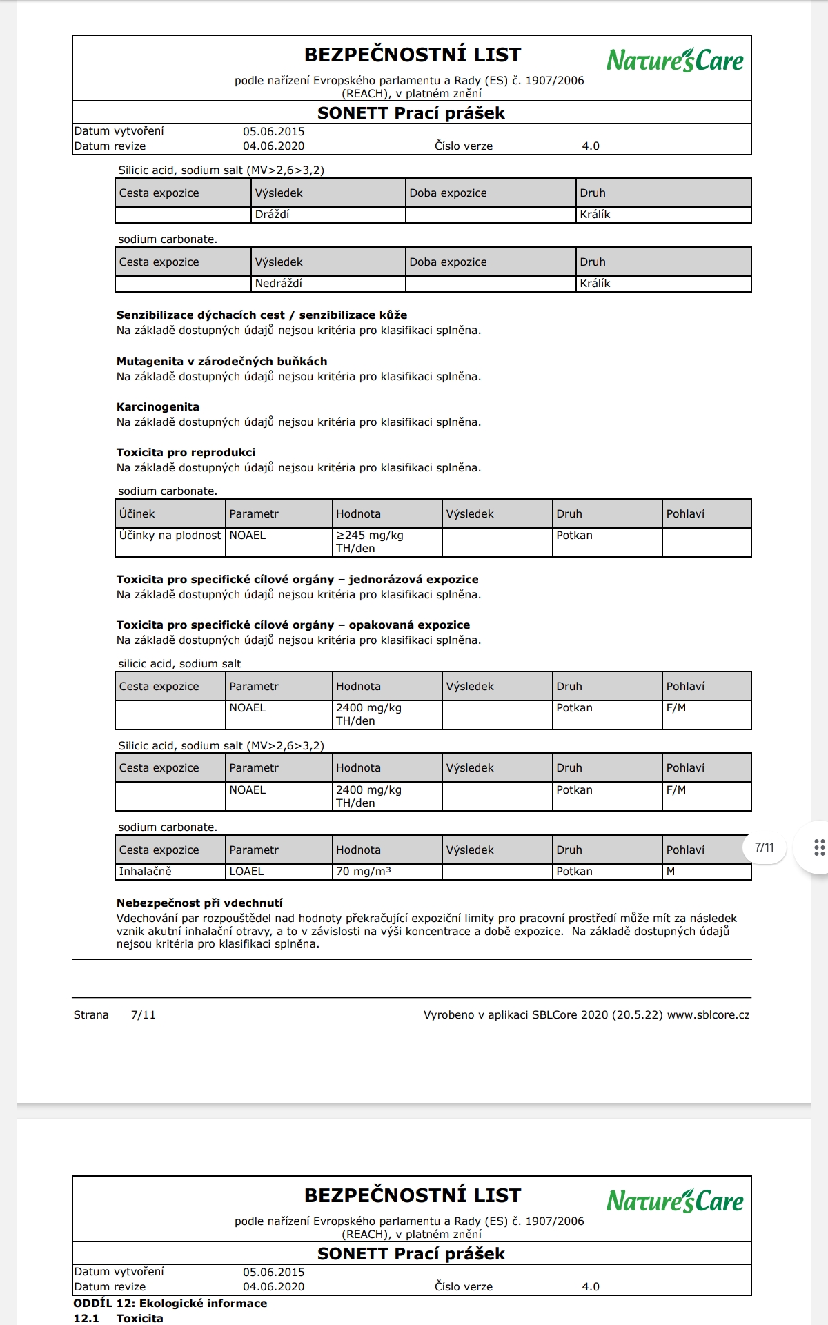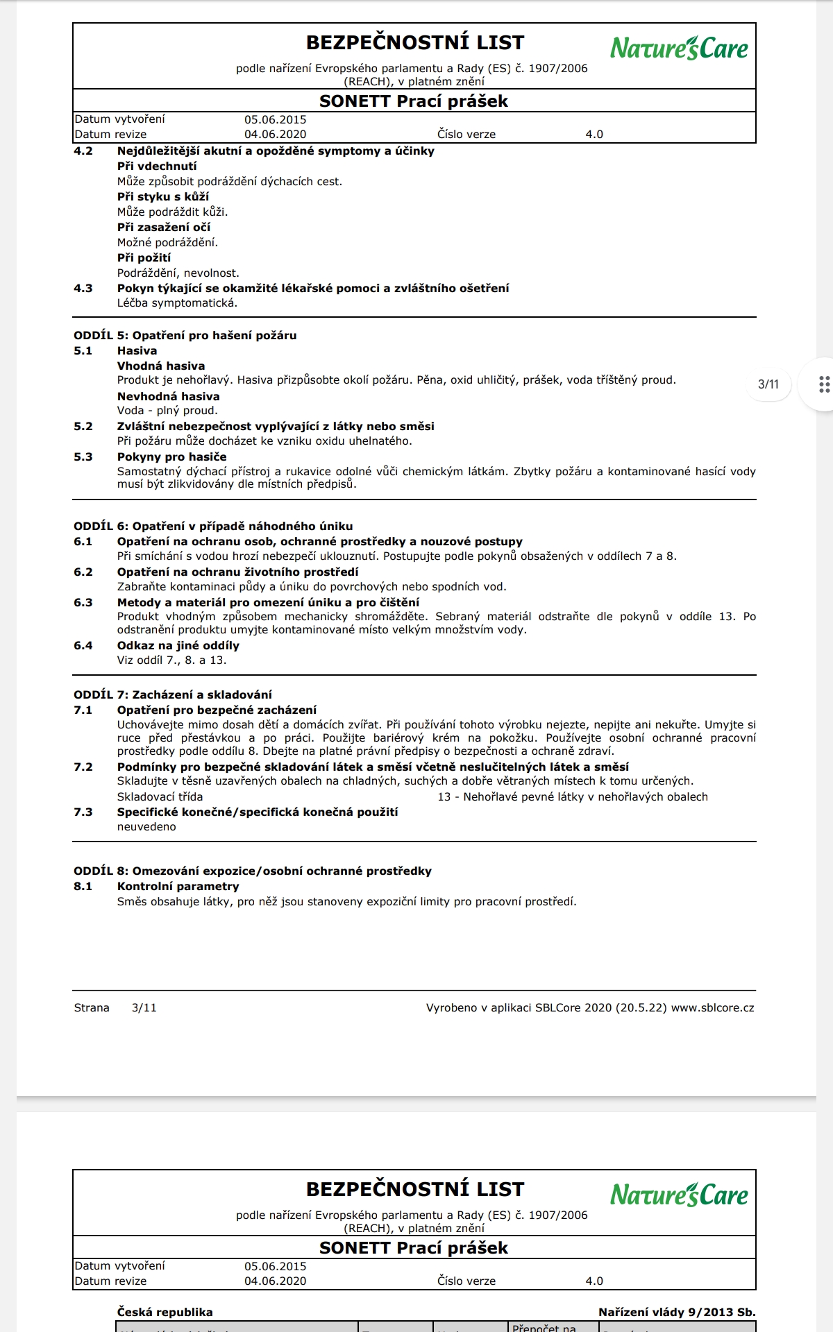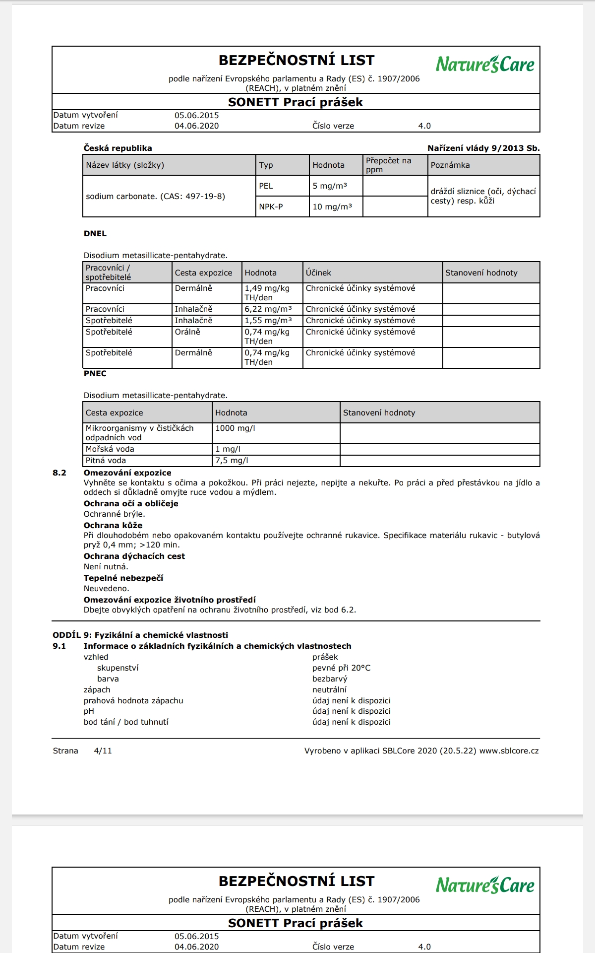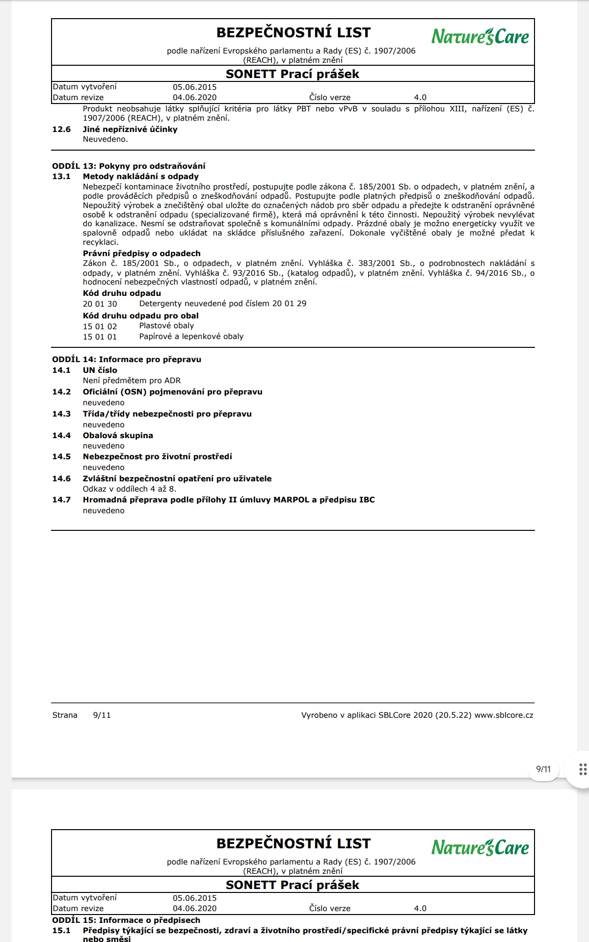 Původ a vlastnosti jednotlivých složek: Prací prostředek SONETT obsahuje jako hlavní účinnou látku mýdlo které se vyrábí z různých rostlinných olejů, palmového, řepkového, kokosového a olivového, a to vařením s louhem. Oleje pocházejí zčásti z ekologické resp. bio-dynamické produkce. Mýdlo jako aktivní mycí látka v sobě jedinečným způsobem spojuje všechny, pro proces praní nezbytné, vlastnosti smáčení nečistoty, jejího rozpouštění a pohlcení. Soda se vyrábí přeměnou vápna pomocí kuchyňské soli. ORTOKŘEMIČITAN vzniká roztavením křemičitého písku a sody. Soda a ortokřemičitan posilují svou zásaditostí mycí louh a podporují uvolňování zejména mastných látek. Zeolit A a vrstevnatý křemičitan mají jako výchozí surovinu křemičité horniny. Vedle své vlastnosti poutat vápník ve vodě poutají tyto složky zároveň i organické látky rozpuštěné v prací vodě a barevné pigmenty a zabraňují jejich usazování na prádle. Derivát kokosového oleje podporuje mýdlo v jeho funkci rozpouštění tuků.