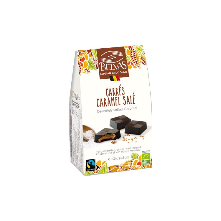 Ručně vyráběné BIO & Fairtrade pralinky z hořké čokolády s karamelem, zvýrazněným mořskou solí z Guérande. BEZ LEPKU, bez alkoholu. Minimální podíl kakaové sušiny v hořké čokoládě: 72%.