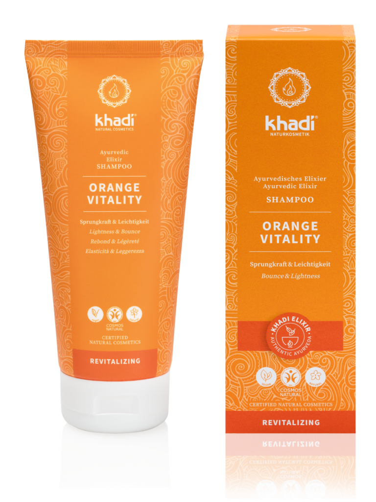 Khadi elixír šampón Pomeranč Vitalita je svěžím nakopnutím pro unavené vlasy a pro vlasy s tendenci k rychlému maštění. Tajemství vitalizujícího působení, svěží lehkosti a odskoku spočívá v Khadi elixíru Pomeranč Vitalita. V této kompozici se propojují účinky ajurvédsky připravených extraktů z indických léčivých rostlin do synergického celku, který umocňuje účinek jednotlivých rostlin. Khadi elixír Pomeranč Vitalita je vyráběn pomocí prastarých ajurvédských postupů nad otevřeným ohněm. Je sestaven podle tradičních ajurvédských receptur a principů.