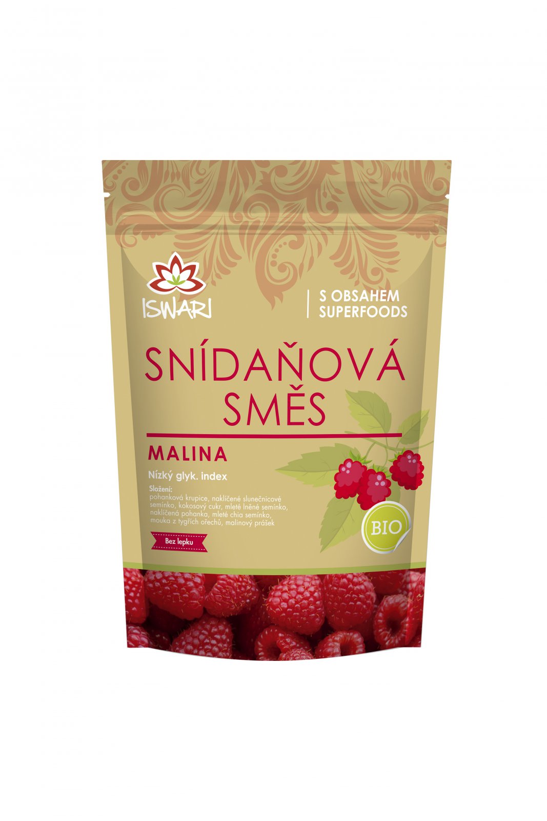 bio pohanková krupice, bio naklíčené slunečnicové semínko, bio kokosový cukr, bio mleté lněné semínko, bio naklíčená pohanka, bio mleté chia semínko, bio malinový prášek (5 %), bio mouka z tygřích ořechů.