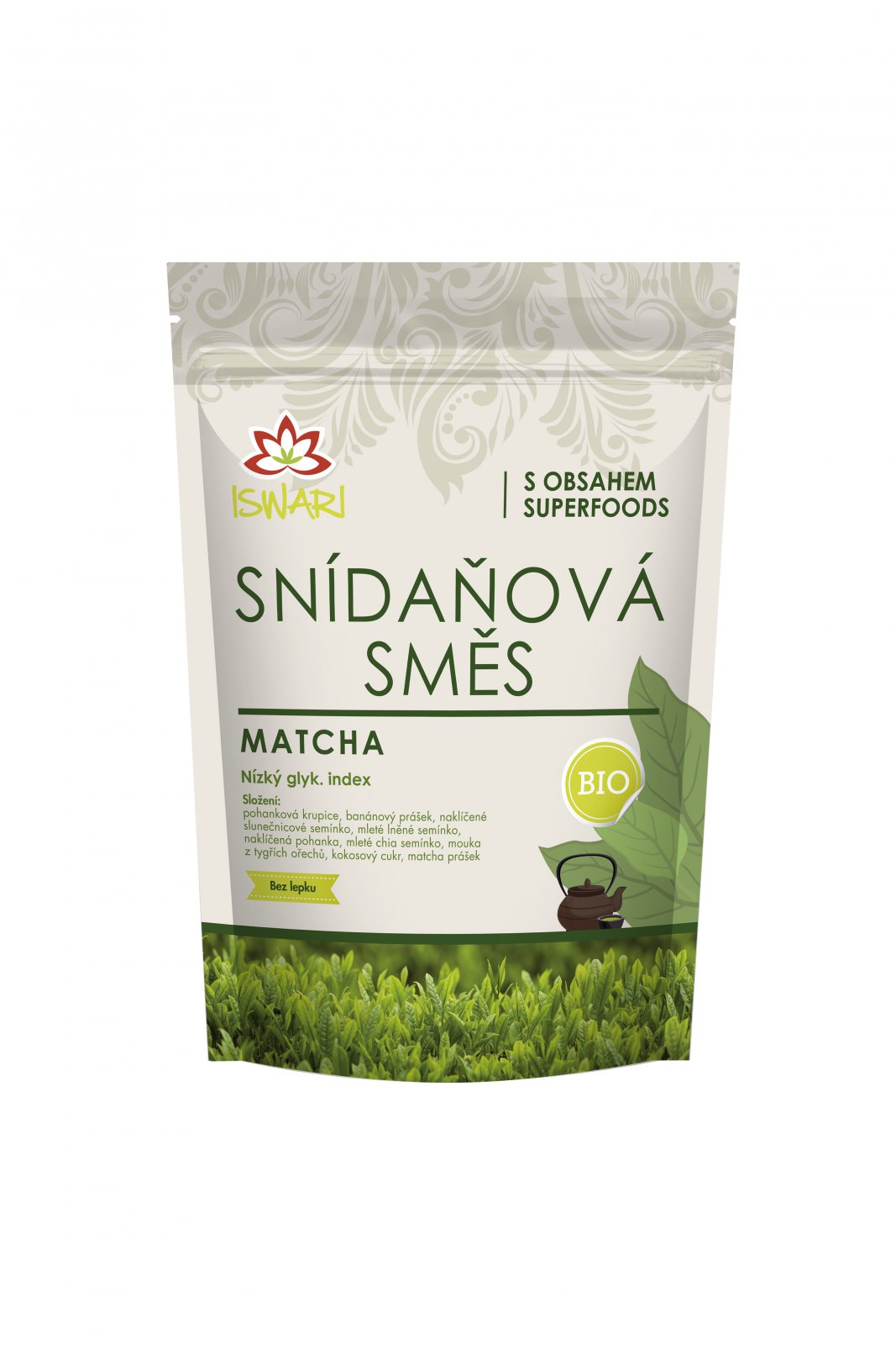 bio pohanková krupice, bio banánový prášek, bio naklíčené slunečnicové semínko, bio mleté lněné semínko, bio naklíčená pohanka, bio mleté chia semínko, bio mouka z tygřích ořechů, bio kokosový cukr, bio matcha prášek (2 %).