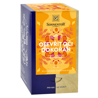 S touto neobyčejnou čajovou směsí s maté, kurkumou a růžovým pepřem můžete soustředně proplout novým dnem a mít tak oči dokořán. Štěstí je…cítit svěžest ranní rosy na bosých nohou a vychutnat si plné aroma i chuť tohoto nápoje. Skvěle ladí s vydatnými pokrmy, sýry a pořádnou snídaní.
