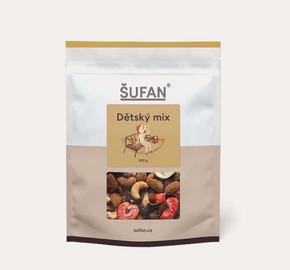 Hledáte křupavou svačinu plnou energie s prvotřídními surovinami? Dětský mix je tou správnou kombinací. Obsahuje totiž mix pražených kešu ořechů, mandlí a kokosových chipsů s kakaem, doplněných o lyofilizovaný banán a jahody. Ideální pro malé, ale i ve