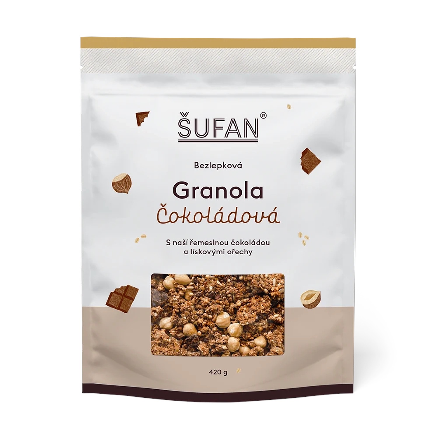 Pokud si potrpíte na chuť prvotřídní tmavé čokolády a rádi si po ránu zakřupete, naši bezlepkovou čokoládovou granolu jsme stvořili přesně pro vás. A když říkáme čokoládovou, máme tím na mysli opravdu hodně, hodně čokolády. Tu si totiž vyrábíme v ŠUFANu sami podle řemeslných postupů a výsledek stojí za to. Vzniká nám pod rukama z výběrových kakaových bobů z Peru, které nejprve šetrně napražíme a pak dojemna meleme v melanžéru. Kromě toho zapékáme granolu ořechovým máslem, sladíme medem, nešetříme blanšírovanými lískovými ořechy z pobřeží Černého moře a nezapomínáme ani na nálož chia a lněných semínek. Lépe to už neumíme.