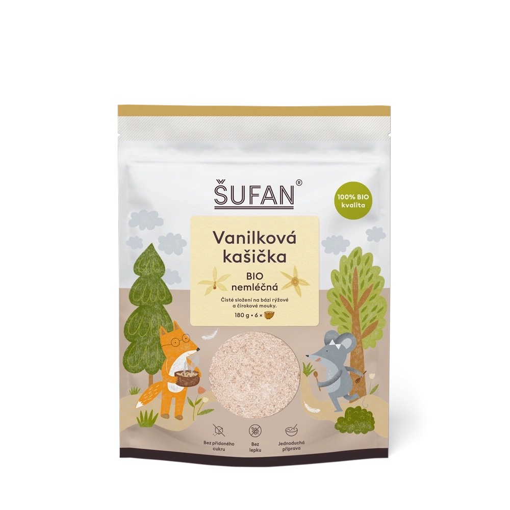 Ve složení najdete rýžovou a čirokovou kaši pro jemnou texturu a voňavou vanilku pro intenzivní a příjemnou chuť.. Navíc jsme obaly navrhli tak, aby podněcovaly dětskou fantazii a zvídavost – na každé kašičce najdete hravé ilustrace našeho lišáka Luba a myšičky Maji – oni totiž tuhle kašičku zbožňují stejně tak, jako ji budou žbožňovat vaše děti!