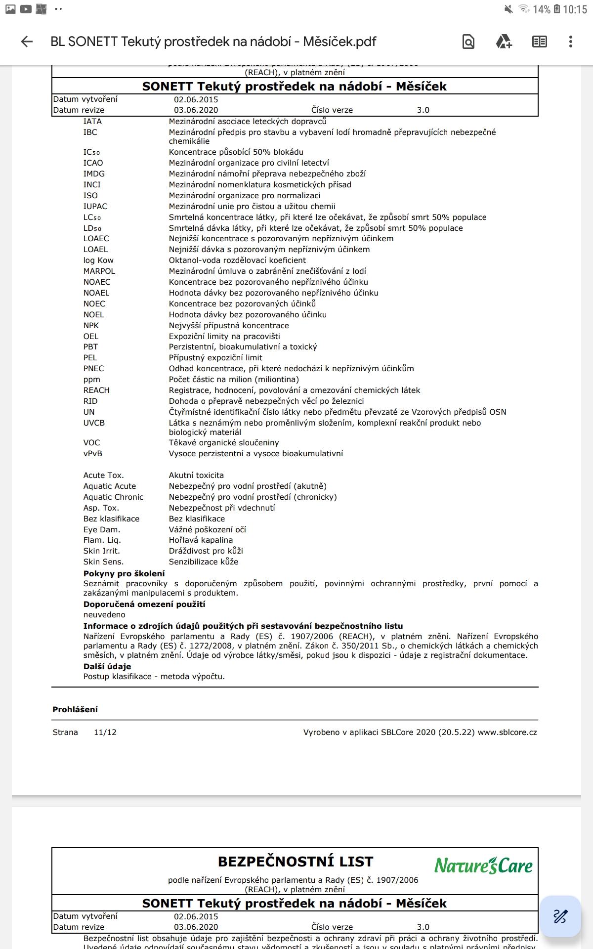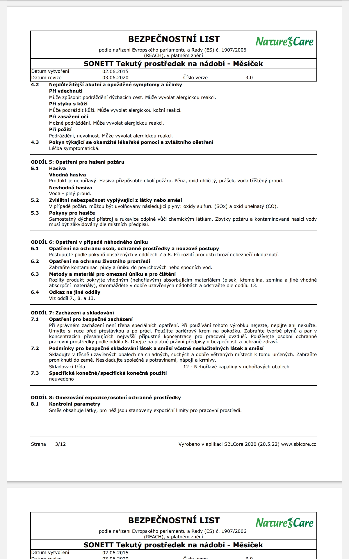 Upozornění: Za teplot pod 10 °C se produkt mění a poněkud houstne a zakaluje se, což za tepla, resp. po mírném protřepání opět zmizí.
