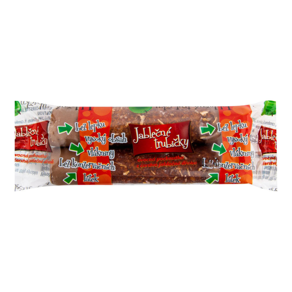 Jablečná trubička je ovocná pochoutka vyrobená ze sušené jablečné dřeně. K výrobě dřeně je použito unikátní technologie drcení a lisování jablek na homogenizéru. Ideální jako svačinka na cesty, do školy či práce. Vhodná pro bezlepkovou dietu.