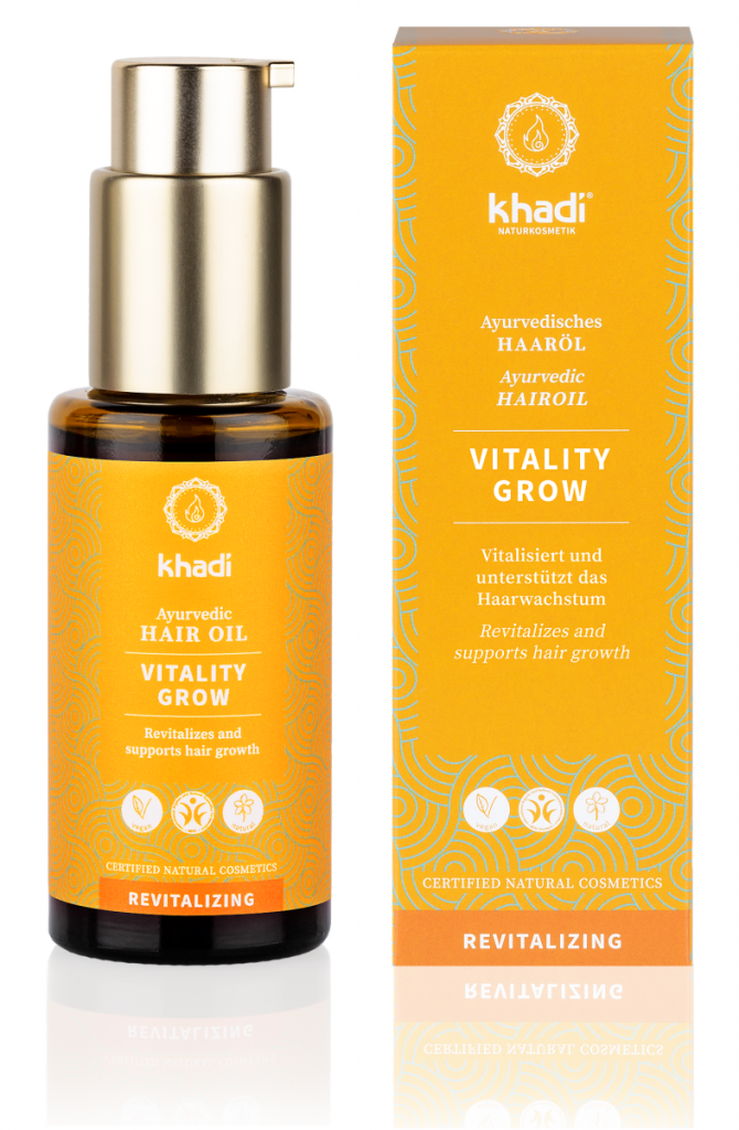 Tajemstvím Khadi oleje VITALITA RŮST pro vlasy a vlasovou pokožku je tajuplný mocný účinek Khadi elixíru: pomocí tisíce let starých tradičních ajurvédských procesů jsou vybrané indické léčivé byliny a plody ohřívány nad otevřeným ohněm, citlivě a za podmínek v závislosti na ingredienci, v řádech hodin či dokonce dní.