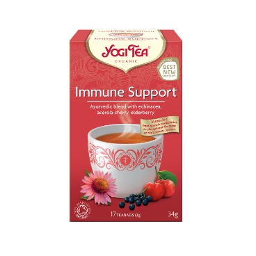 Zklidňující, zahřívající, s přírodním vitamínem C. Jak se mění roční období, potřebuje někdy náš imunitní systém trochu podpořit. Kromě pestré a vyvážené stravy, jako součásti zdravého životního stylu, si dopřejte šálek horkého nálevu Podpora imunity YOGI TEA®. Hořkosladká chuť echinacey (třapatky nachové) je zkombinována s ovocnými plody černého bezu a voňavou bazalkou. Vitamín C z třešně aceroly přirozeně posiluje imunitní systém.