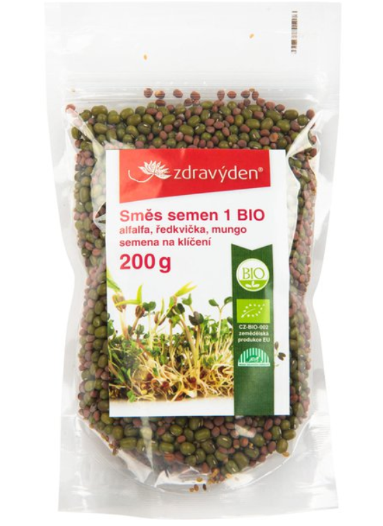 Složení: Semena alfalfa - tolice vojtěšky BIO (Medicago sativa), ředkve seté - ředkvičky BIO (Raphanus sativus, Daikon), mungo fazole BIO (Vigna radiata)
